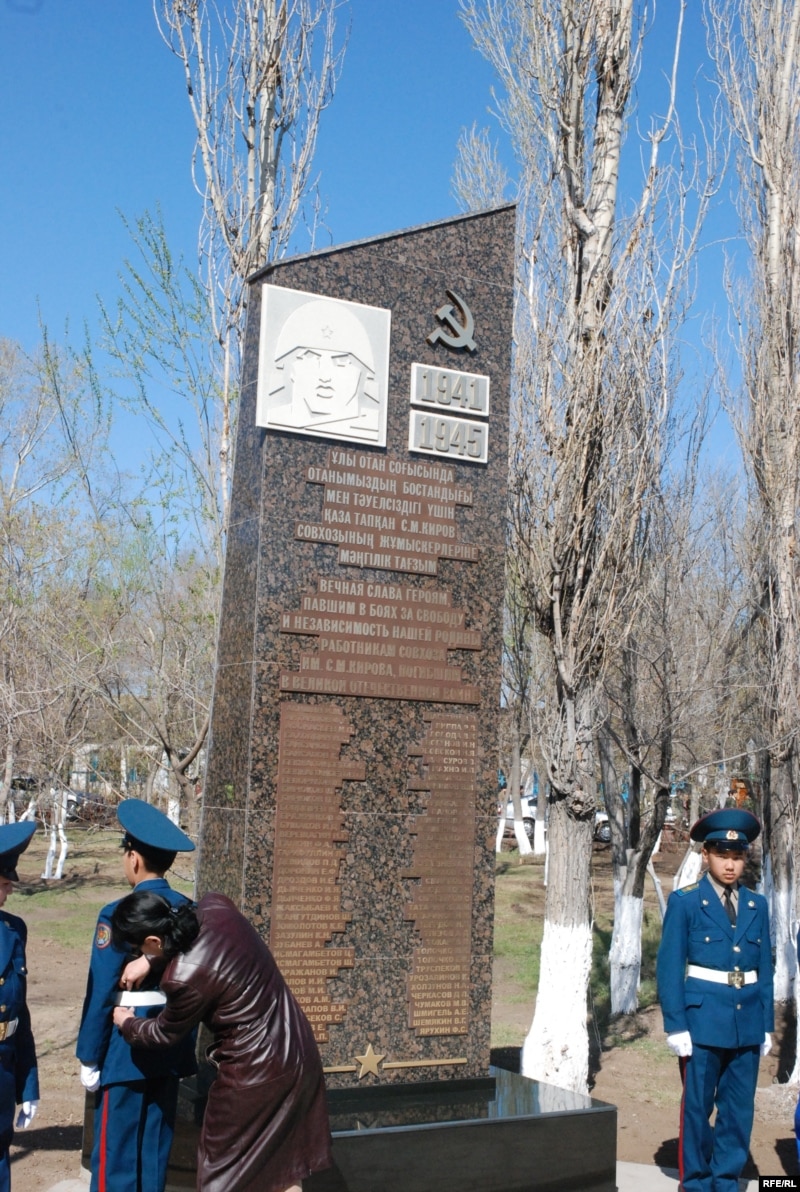Скандал разразился в день сноса мемориала советским воинам Второй мировой войны. Это была единственная, украшавшая центр поселка стела, у которой ежегодно, 9 мая, собирались местные ветераны. Местные старожилы вызвали прессу и прямо у снесенного мемориала организовали митинг. Как рассказали жители поселка, стелу не просто снесли, а буквально захоронили на месте памятника. Вот что сообщила нашему радио Азаттык дочь ветерана войны, шестидесятилетняя Елена Воробьева: