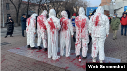 Участники облились красной краской — так организаторы акции изобразили жертв кровавых событий в новейшей истории Казахстана.
