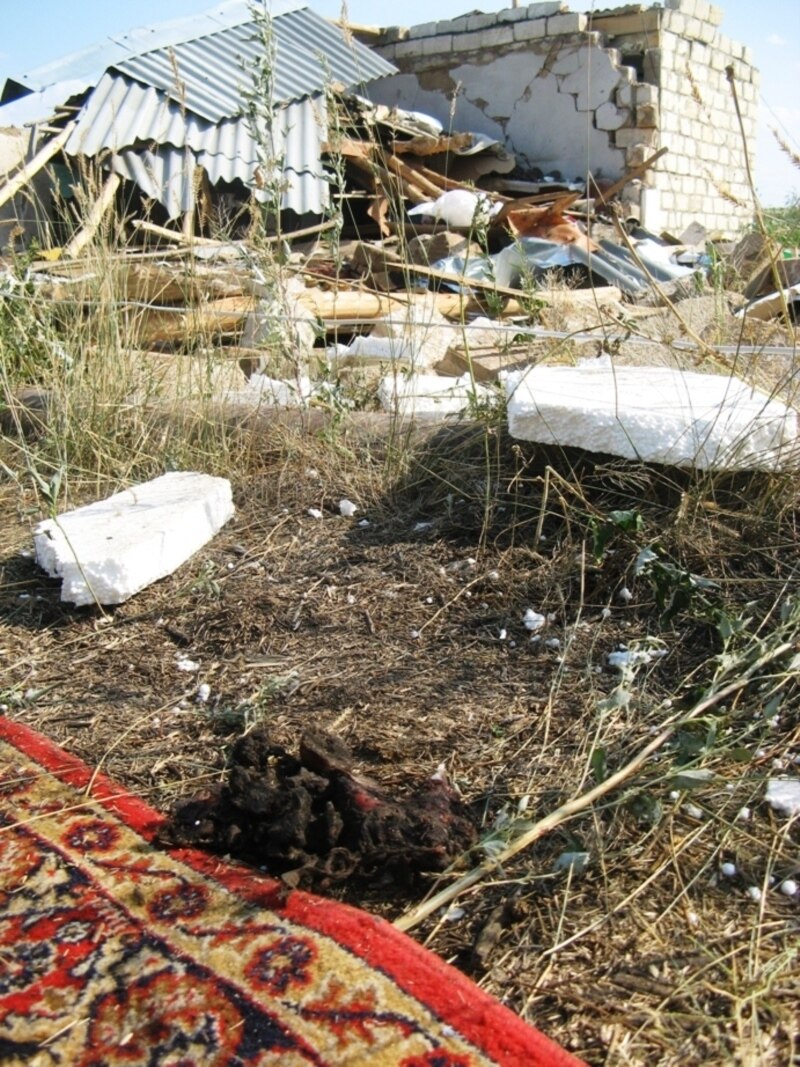 печь в центре комнаты. На улице валяются запасные части сотовых телефонов, книга Бенджамина Спока «Ребенок и уход за ним»; возле расстеленного ковра – останки тела погибшего. Возле руин дома лежала квитанция по уплате налога, она выписана на имя М. Рыспаева.