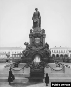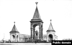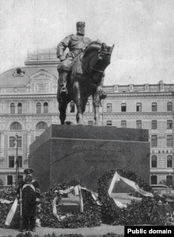 Бронзовый памятник был обезглавлен, а затем демонтирован в 1918 году. Собор на заднем плане тоже был разрушен советскими властями, которые пропагандировали атеизм. В 1990-х годах памятник был восстановлен.