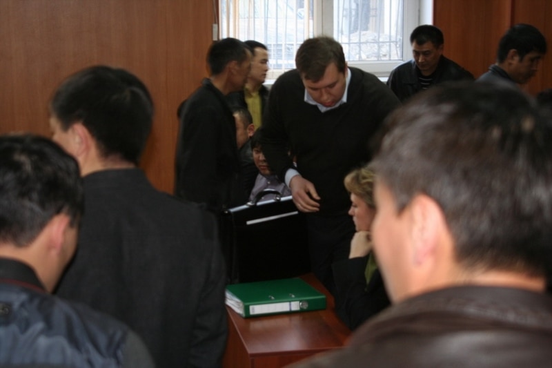 Ответчики и представитель истца адвокат Андрей Казначеев (в центре) в суде. Алматы, 7 апреля 2011 года.