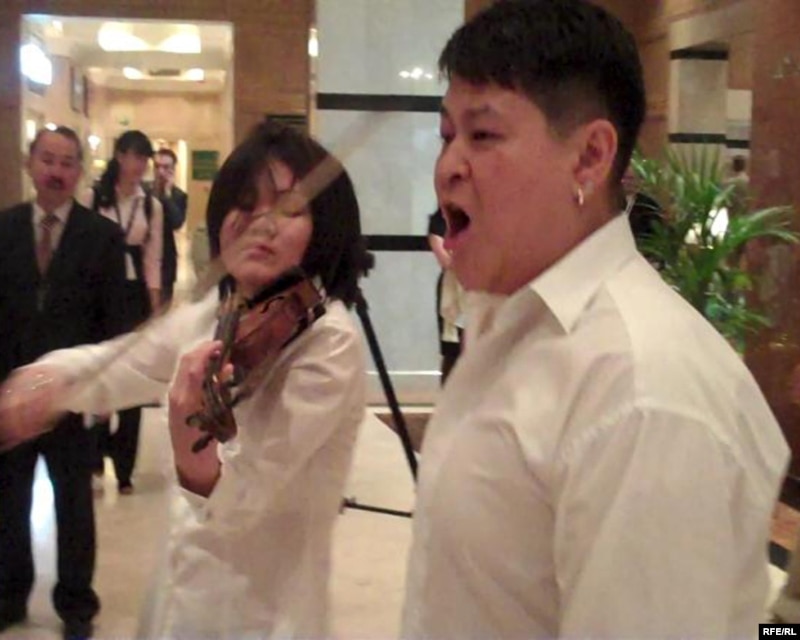 Скрипачка Айнура Саденова и художник Канат Ибрагимов проводят акцию протеста в кулуарах Евразийского медиа-форума. Алматы, 27 апреля 2010 года.