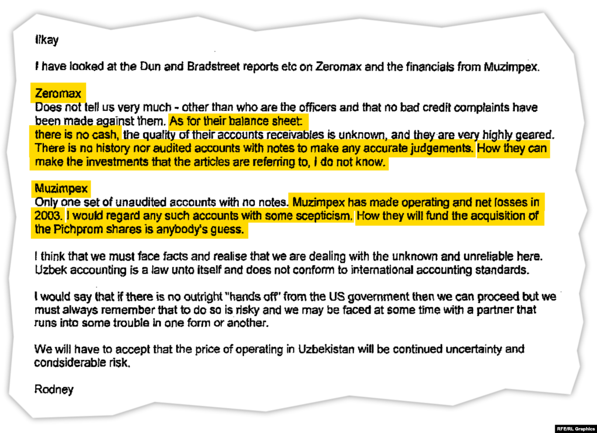 «Нам придется согласиться с тем, что ценой работы в Узбекистане будут продолжающаяся неопределенность и значительный риск», – написал он в электронном послании, адресованном ведущему юристу в штаб-квартире Coca-Cola в США.