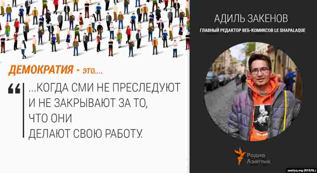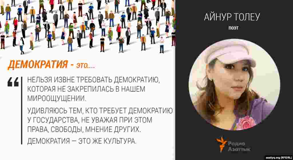 Азаттык спросил казахстанцев, что они понимают под словом «демократия». 15 сентября, в Международный день демократии, мы собрали точки зрения разных людей — активных, творческих и просто рядовых казахстанцев — в одной галерее.