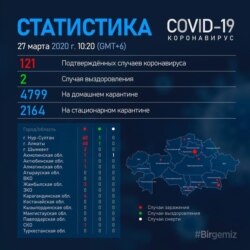 По данным на последний час, 27 марта, в Казахстане подтверждены 124 случая коронавируса: в Нур-Султане — 60, в Алматы — 48, в Караганде — четыре, в Жамбылской области — три, в Атырауской области — три, в Шымкенте — два, в Алматинской, Актюбинской, Северо -Казахстанской и Акмолинской областях — по одному случаю.