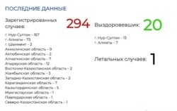 По последним данным, в Казахстане зарегистрировано 294 случая заражения коронавирусной инфекцией. 20 человек выздоровели, один скончался.
