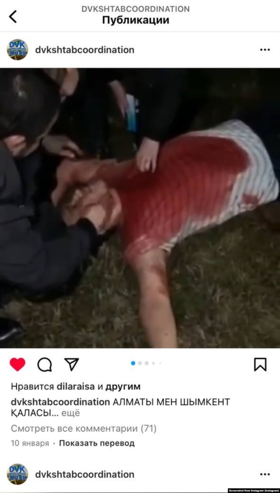 Позже родственники увидели в Instagram’е видео (опубликовано на странице dvkshtabcoordination. — Ред.) с истекающим кровью мужчиной, лежащим на улице Назарбаева, где находится городской акимат. Они узнали в нем Багдада. Люди на видео растерянно проверяют сердцебиение мужчины в окровавленной рубашке, отчетливо слышны выстрелы.