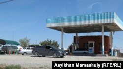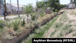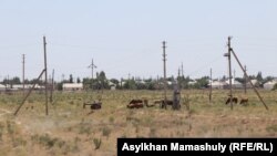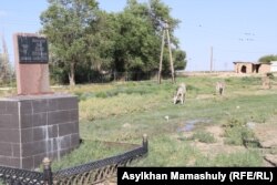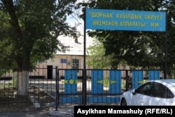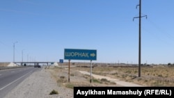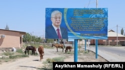 Велосипедист едет мимо баннера с изображением бывшего президента Казахстана Нурсултана Назарбаева. Село Шорнак, Сауранский район, Туркестанская область, 30 июня 2021 года Photo: Asylkhan Mamashuly (RFE/RL)