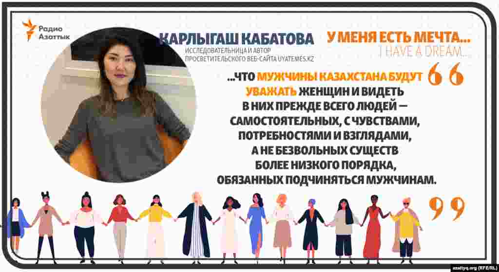Азаттык предложил казахстанским женщинам продолжить известную фразу I have a dream... К 8 марта мы получили от 8 женщин самые разные ответы. Но все они объединены стремлением к справедливости, свободе выбора, равноправию.