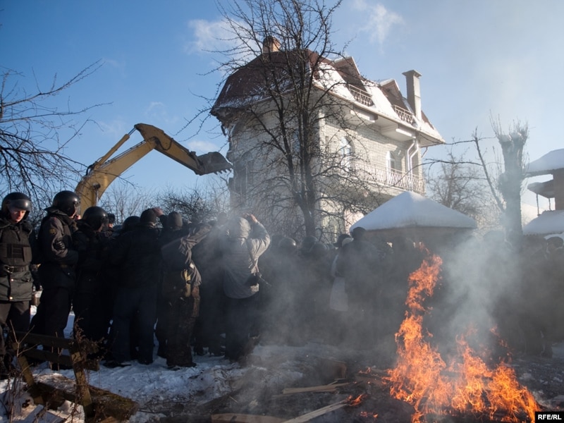 Снос дома, расположенного на 10-м участке, начался в полдень. С утра все подъезды к этому коттеджу были заблокированы милицией и журналисты никак не могли подступиться к этому строению. Но когда ковш экскаватора зацепил крышу здания, милиция пропустила корреспондентов к месту события.