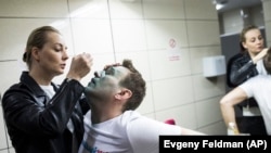 Рабочий закрашивает мурал с Навальным Photo: Olga Maltseva (AFP)