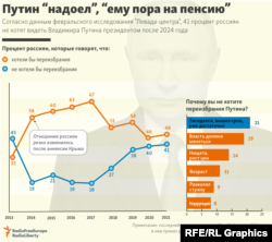 По данным исследования «Левада-центра», проведенного в феврале 2021 года, 41 процент россиян не хотят видеть Владимира Путина президентом после 2024 года. Половина из них говорят, что «президент засиделся, надоел и ему пора на пенсию». Только 8 процентов опрошенных заявили, что хотят смены президента из-за коррупции. При этом альтернативы Путину большинство россиян до сих пор не видит.
