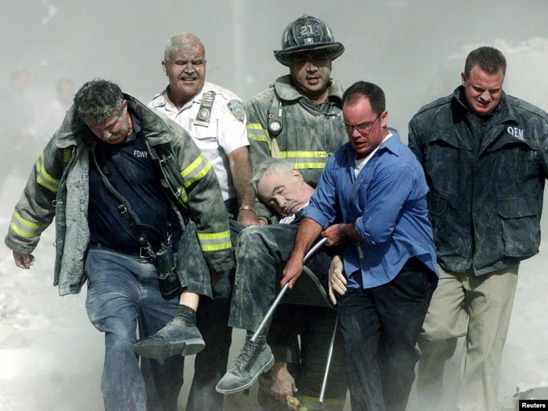 Мужчина стоит у руин Всемирного торгового центра, разрушенного вследствие теракта. Нью-Йорк, 11 сентября 2001 года.