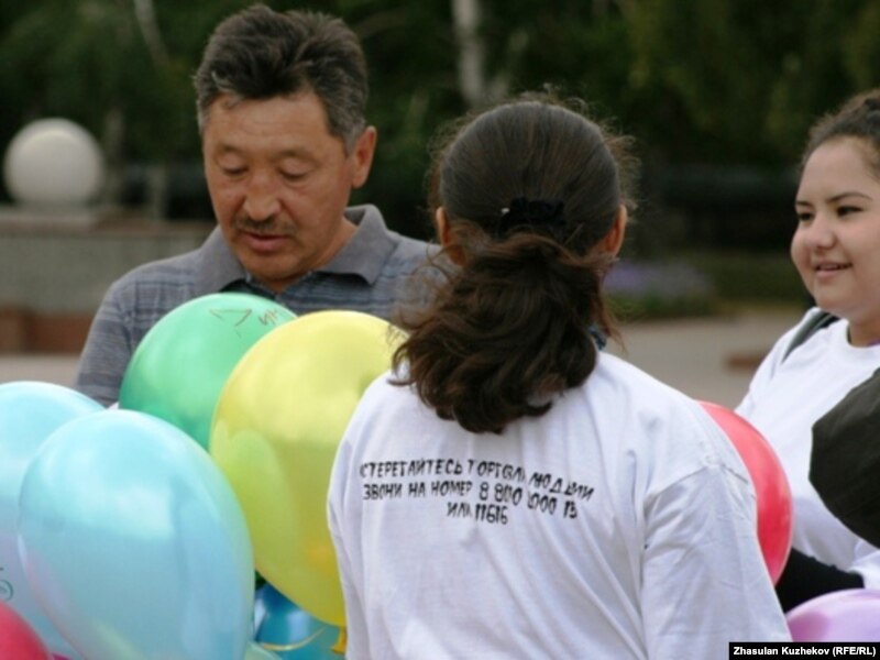 Активисты неправительственных организаций выпускали шары в небо в память жертв работорговли. Астаны, 23 августа 2010 года.