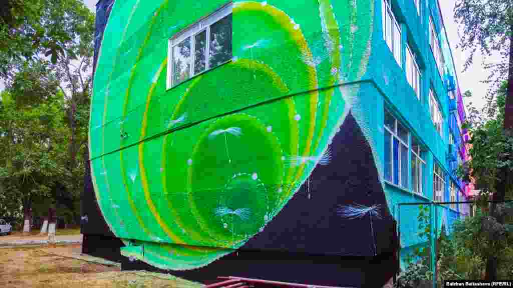 Марина Зуми раскрасила наружные стены Школы изобразительного искусства и технического дизайна имени А. Кастеева. Фото Балжан Балташевой, фотографа Казахской редакции Азаттыка. 21 июля 2015 года.