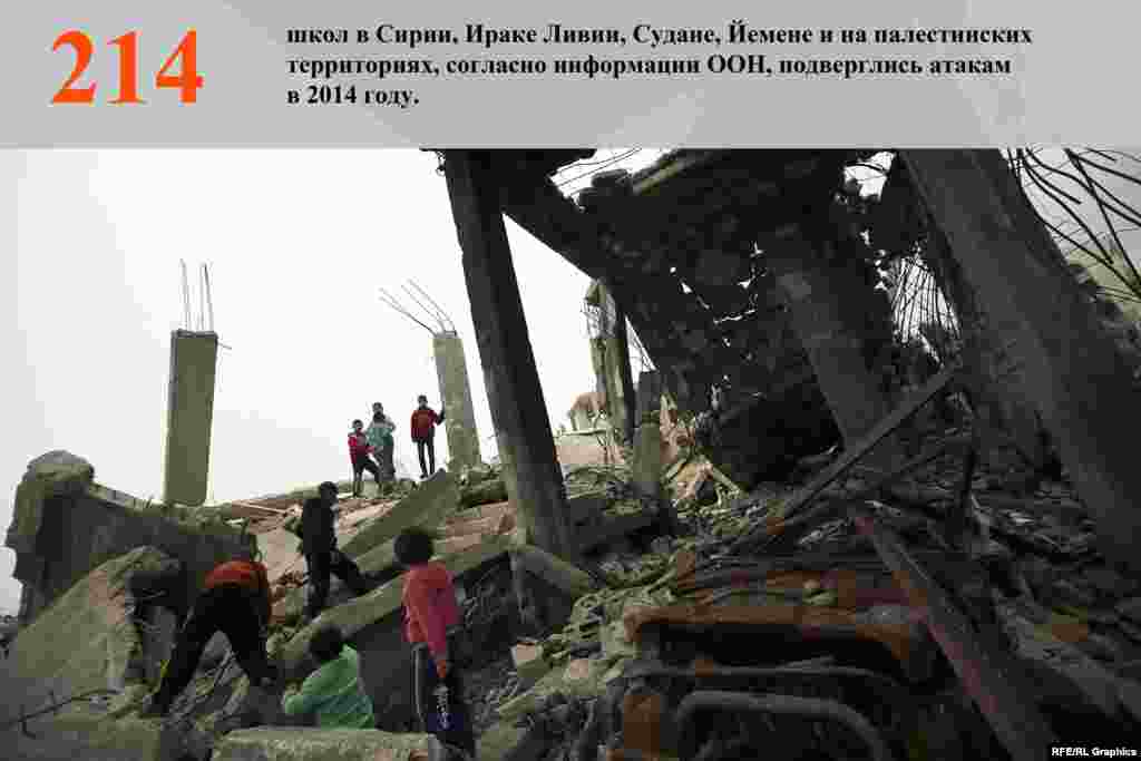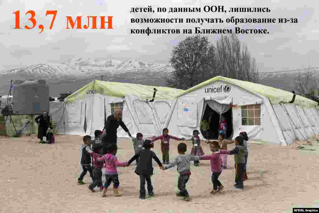 Число запусков ракет с Байконура, нелегальных мигрантов в Европе, детей на Ближнем Востоке, оставшихся без школы из-за конфликтов, и другая иллюстративная статистика.